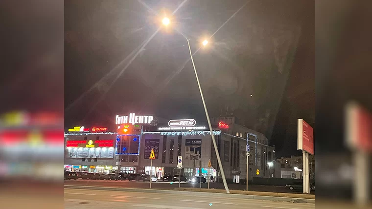 На них видно, что столб отклонился достаточно сильно от стандартной вертикали, но при этом фонарные лампочки исправно работают. Сам столб находятся напротив торгового центра «Сити Центр».