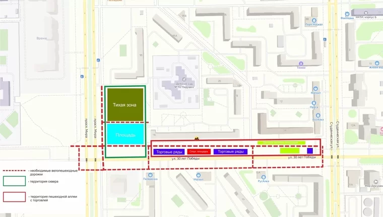 - зона торговли и активного отдыха, где можно расположить летние кафе, магазины, детские и спортивные площадки.