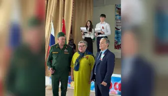 После этих стихов ребята в зале раздали всем ветки сирени. Альфию Михайлову наградили памятной медалью от Союза Советских офицеров. В заключении третьеклашки исполнили песню «За тебя, Родина-мать!». Тут уже мало кто в зале сдерживал слёзы. Честно говоря, и у меня ком в горле встал.