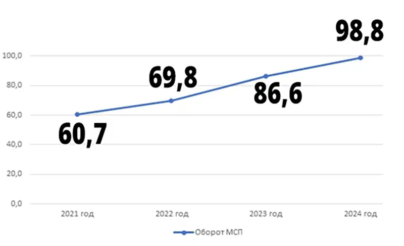 Если говорить о субъектах малого и среднего предпринимательства (МСП), то здесь Нижнекамский район по обороту средств является одним из лидеров в Татарстане (в 2024 году — около 100 млрд руб.). В разрезе пяти последних лет цифры следующие (см. график).