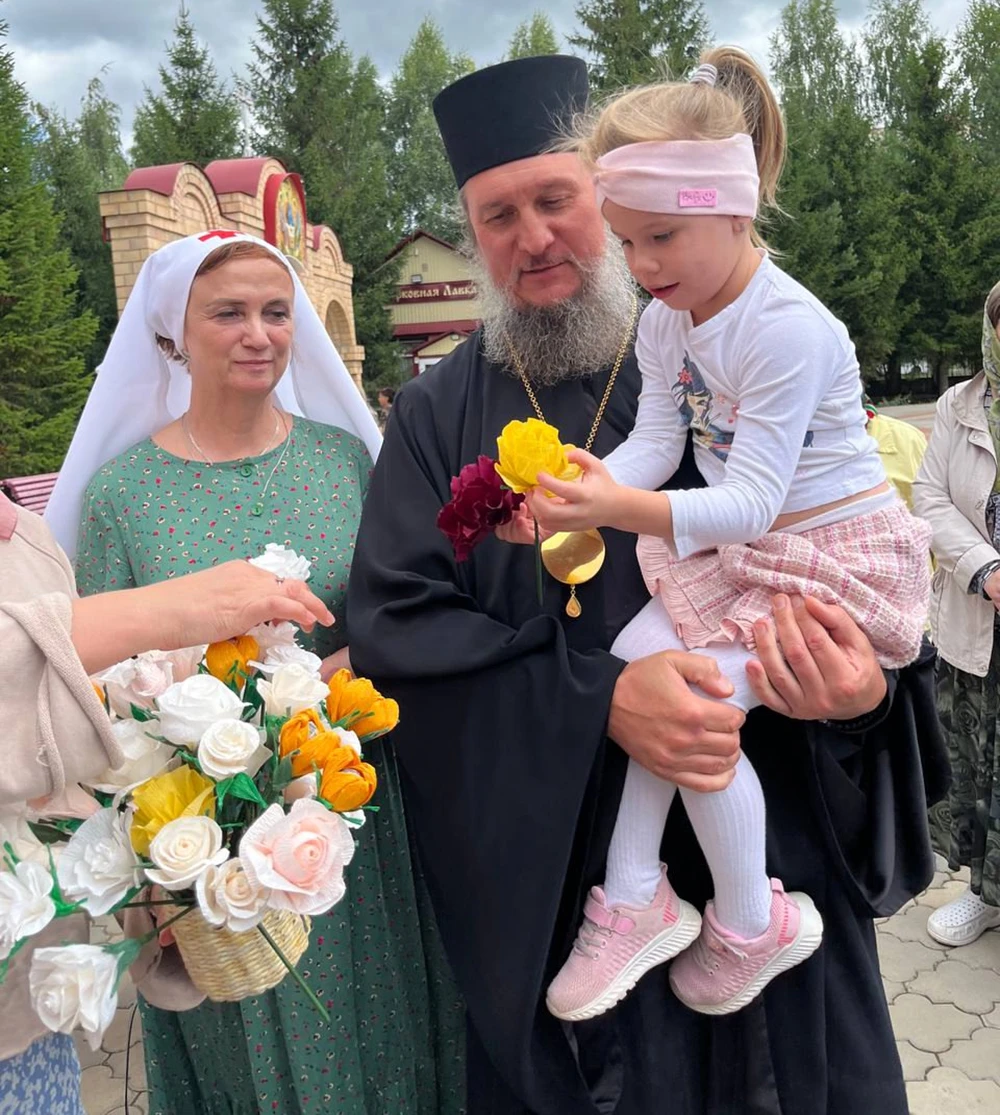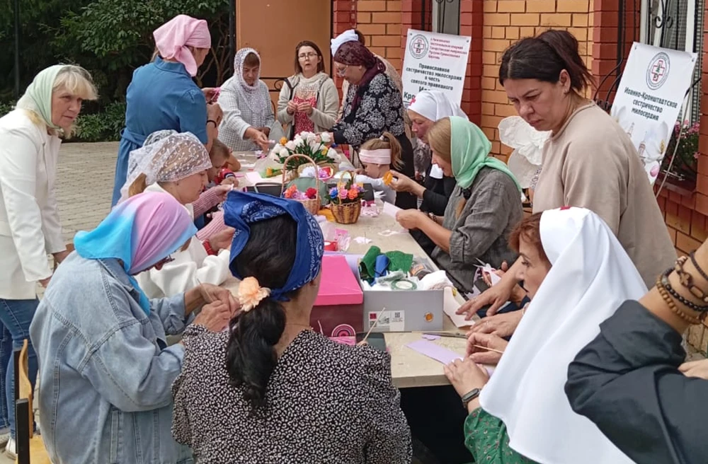 После литургии Владыка поздравил всех присутствующих с праздником, а затем отправился на беседу с сестричеством милосердия, которые у входа в храм организовали для прихожан благотворительный мастер-класс «Белый цветок» в рамках подготовки к Стахеевскому фестивалю.