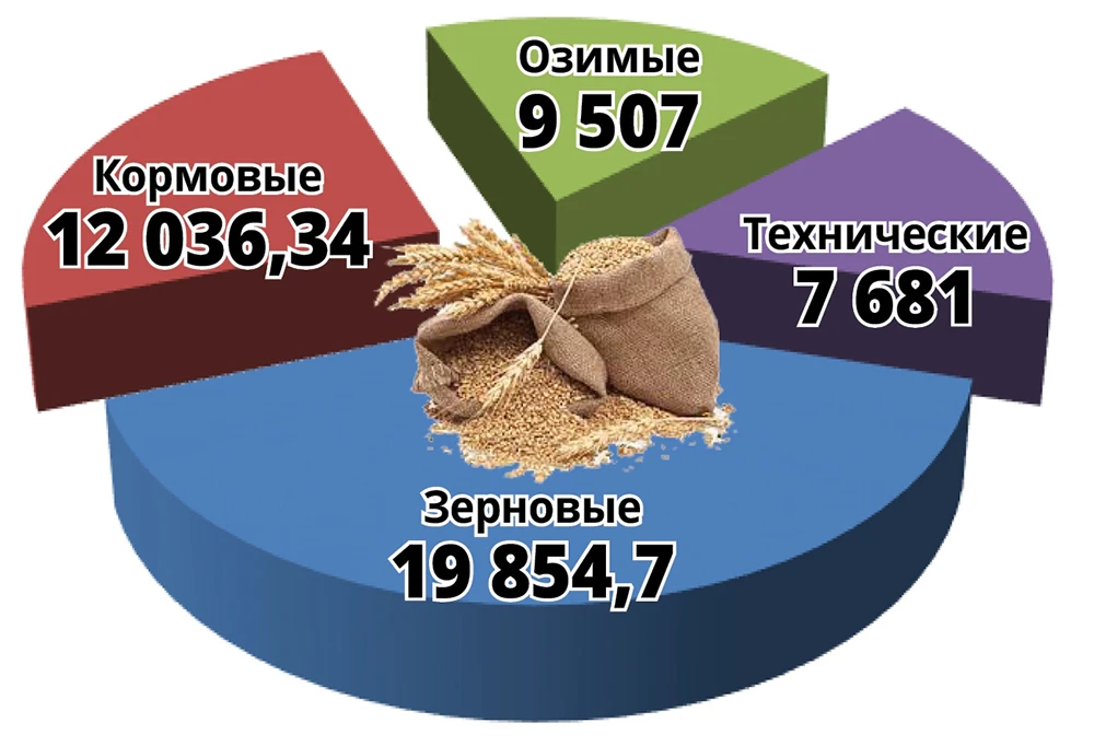В сравнении с прошлым годом, в этом увеличились площади у зерновых и технических культур (на 1706,3 га и 582 га соответственно), сократились площади озимых и кормовых культур (165 га и 2585,39 га соответственно).