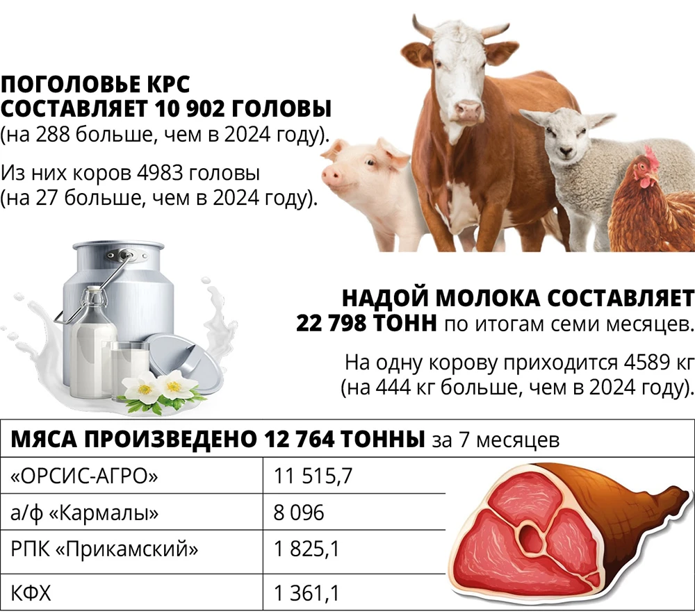 Кормовые культуры. В настоящий момент на одну условную голову в НМР заготовлено 28,21 центнера, что выше среднего показателя по республике (22 центнера). В относительных величинах заготовка кормов выполнена на 70,2% (19 700 тонн сена и 71 000 сенажа).