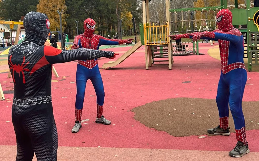 На снимке трое парней, переодетых в костюмы человека-паука, обыгрывают ситуацию, завирусившуюся в интернете много лет назад. Правда на этот раз действие известного мема разворачивается на улицах Нижнекамска, а точнее — в парке «Семья».
