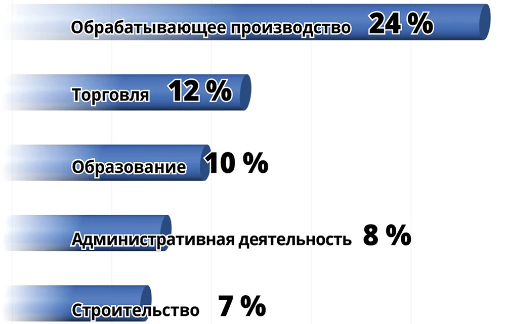 На учёте в РТ (по состоянию на 20.10.25 г.) стоят 3 290 человек (в НМР 333 чел.) Уровень безработицы составляет 0,21% (0,16% по РТ). По отраслям большинство безработных ранее были заняты в следующих отраслях (%):