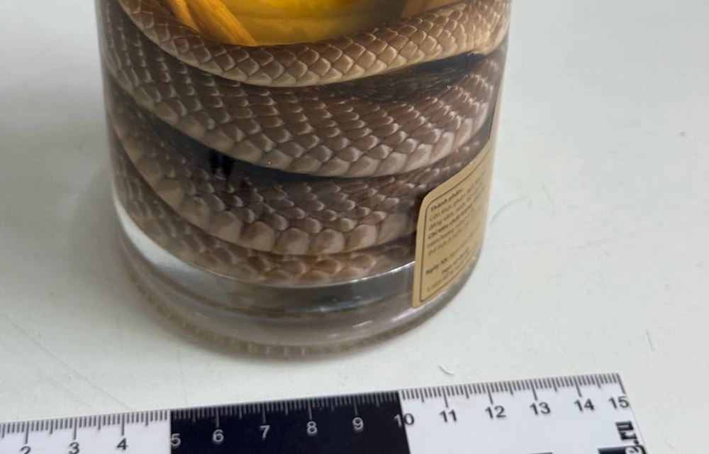 Заспиртованную змею женщина привезла из Вьетнама. Этот вид подпадает под действие Конвенции о международной торговле видами дикой фауны и флоры, находящимися под угрозой исчезновения, то есть для его ввоза нужны специальные сертификаты. Женщине грозит штраф и конфискация напитка, сообщает официальный Telegram-канал Федеральной таможенной службы России.