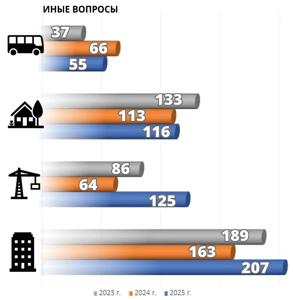 Иные вопросы — общественный транспорт, земля и имущество, строительство, жилищные условия.