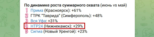 Исследования проводились среди 60 телеграм-каналов региональных телевизионных каналов с 10-20 тыс. подписчиков. НТР 24 показал прирост в 29%, заняв четвёртое место в рейтинге.