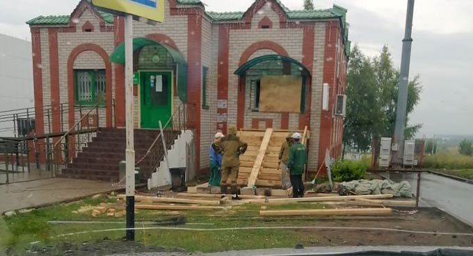 Вскоре после публикации в комментариях появилось другое фото, на котором видно, что банкомат закрыли фанерой, а рабочие начали возводить новую лестницу.