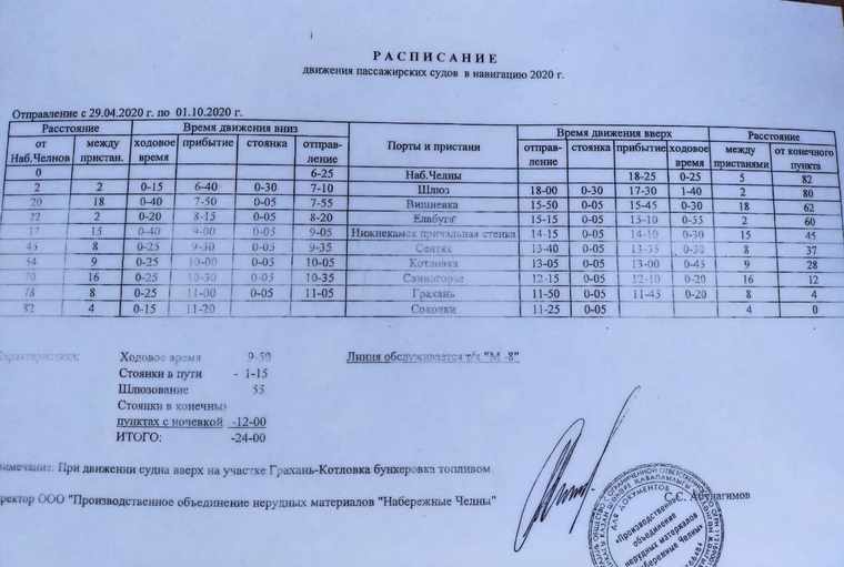 Также опубликовано расписание. От пристани Нижнекамска теплоход отправляется в 9:05 и в 14:15.