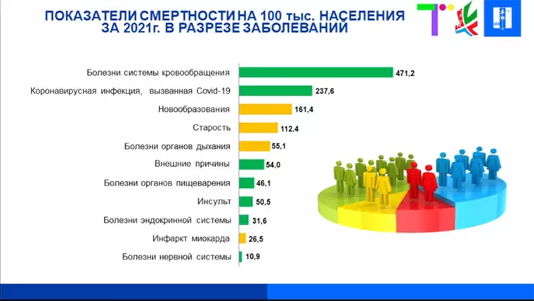 Первое место по причинам смерти в Нижнекамске и районе заняли сердечно-сосудистые заболевания - 472,1 на 100 тыс. населения. На втором месте — смерти от COVID-19 237,6 на 100 тыс., на третьем от онкологии — 161,4 на 100 тыс. населения.
