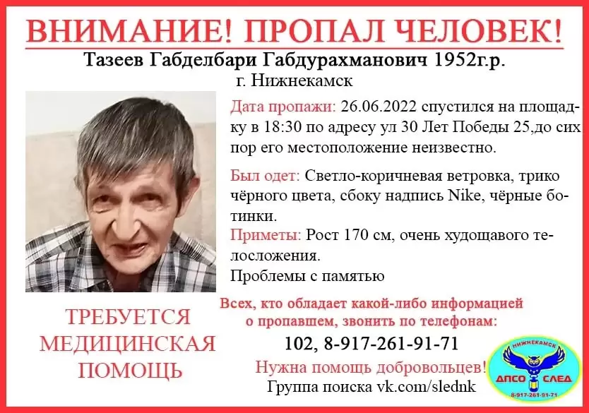 В Нижнекамске пропал 70-летний Габделбари Тазеев.