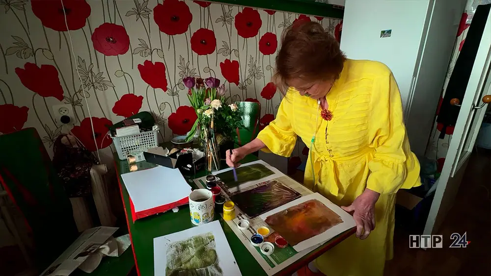 Из-за некоторых проблем со здоровьем Айзиряк Мустафина все больше работает в технике монотипия, создавая неповторимые образы и картины.