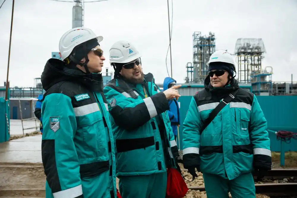 Одним из первых крупных объектов на стройплощадке была установлена продувочная емкость высотой 30 метров и весом 110 тонн. Для доставки этого крупногабаритного оборудования была построена дорога из железобетонных плит протяженностью почти в километр, а также подготовлена площадка для работы тяжелой грузоподъемной техники. В настоящее время ведется монтаж установки разделения пропана и азота, которая играет ключевую роль в подготовке сырья. Завершение монтажа основного оборудования по этой установке запланировано на третий квартал 2026 года.