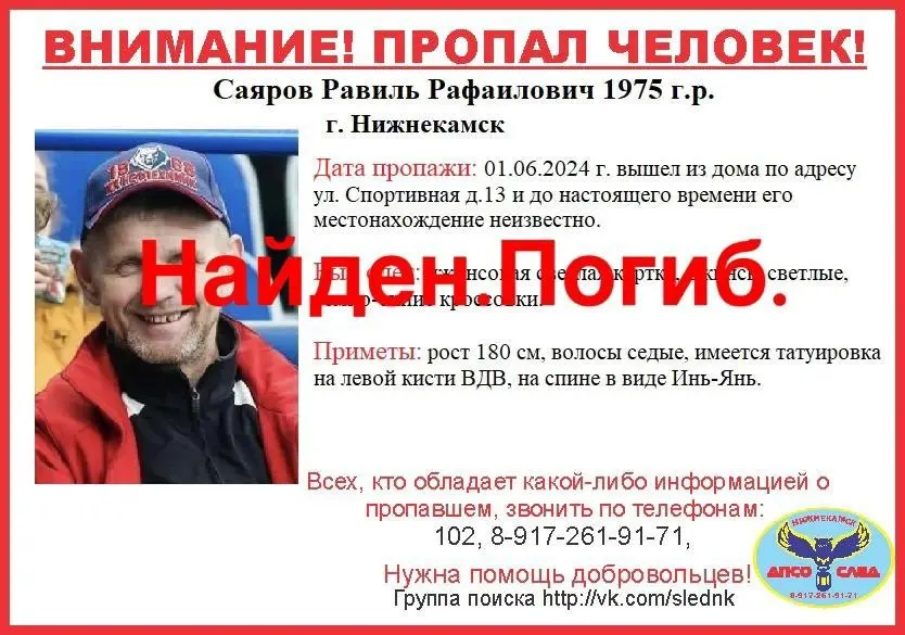В Нижнекамске найден мертвым 49-летний Равиль Саяров, который пропал первого июня.