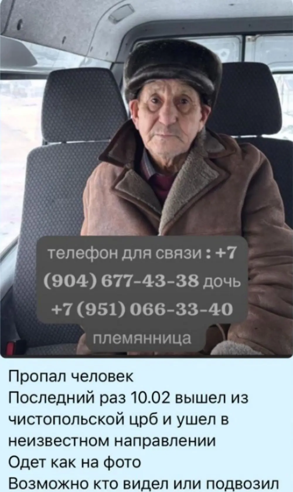 Родственница написала, что в последний раз мужчину видели в ЦРБ Чистополя, он вышел из больницы и ушёл в неизвестном направлении. Одет в коричневую дублёнку и черную меховую кепку, синие джины и черные ботинки. Рост 160–165 см.