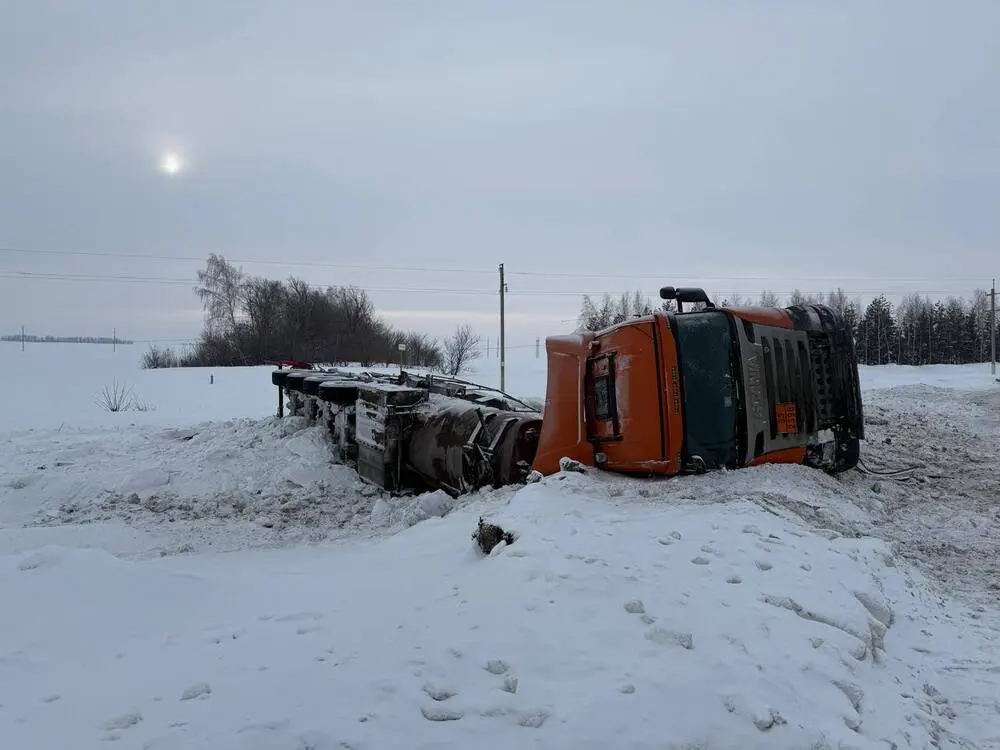 В четверг, 27 февраля, в Бугульминском районе в кювет опрокинулся грузовой автомобиль «Скания».