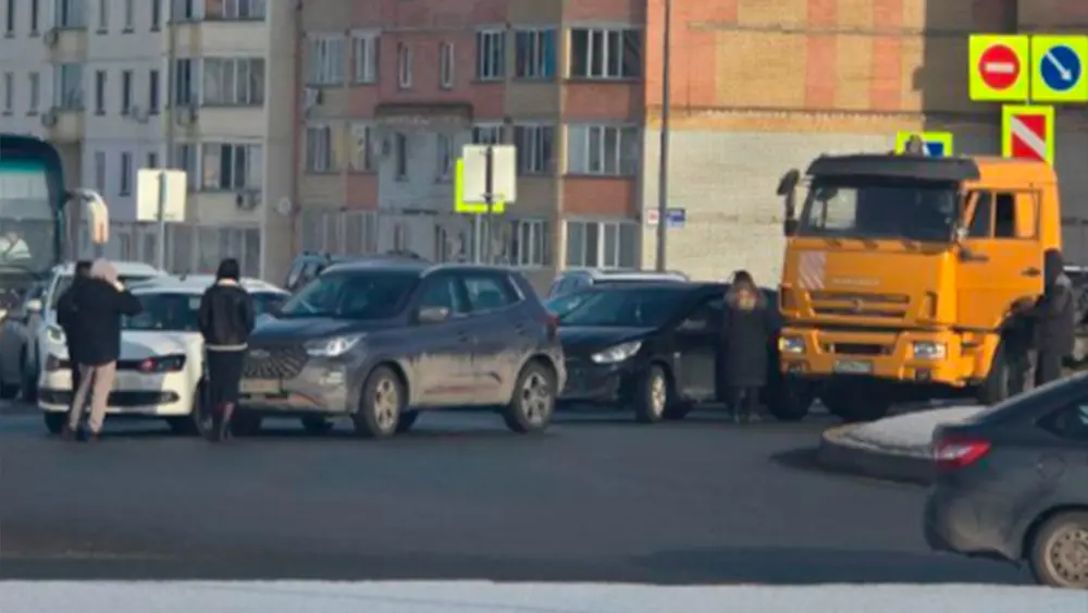 В Нижнекамске на кольцевой развязке проспектов Мира и Строителей во вторник утром столкнулись три иномарки и большегруз.