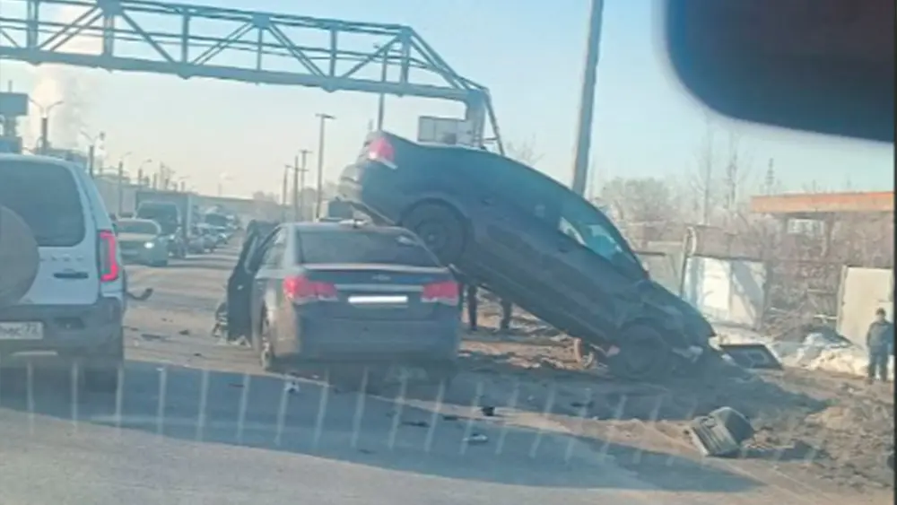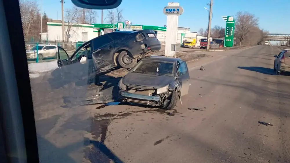 Фотоснимки с места происшествия публикуют очевидцы. На них видно, что после аварии чёрная иномарка оказалась на крыше легковушки. Оба автомобиля получили повреждения.