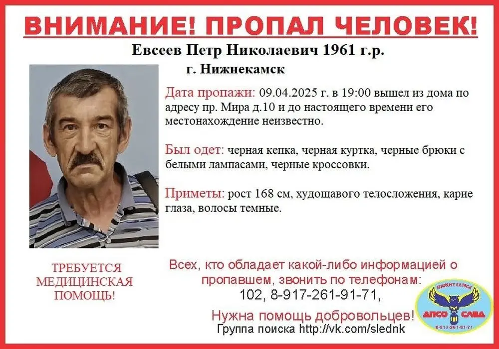 Мужчина одет в черную куртку, такого же цвета брюки с белыми лампасами, кроссовки, на голове — чёрная кепка. Рост пропавшего нижнекамца 168 см, он худощавого телосложения. У мужчины карие глаза и тёмные волосы.