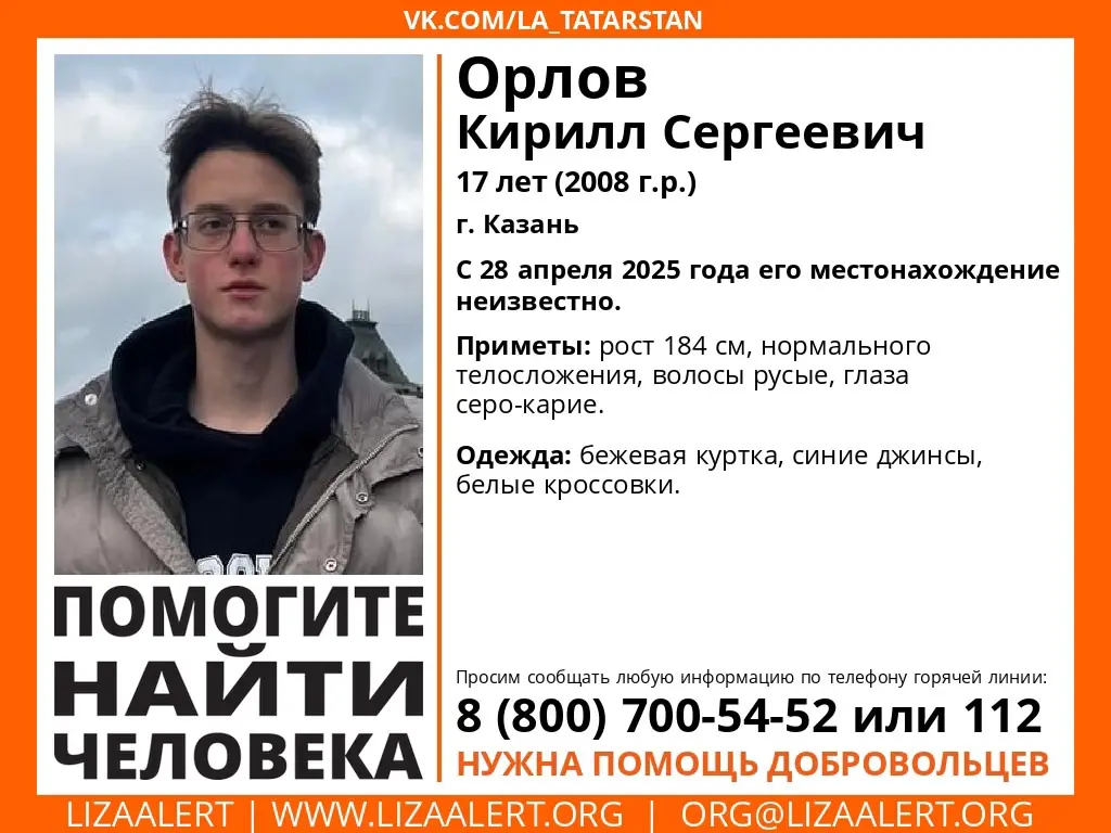 В Казани пропал 17-летний Кирилл Орлов. Подросток не выходит на связь с 28 апреля.