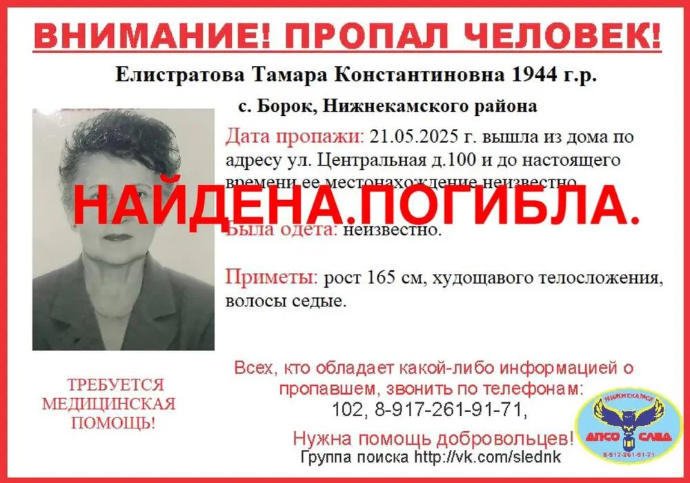 Пропавшая 81-летняя жительница села Борок Нижнекамского района Тамара Елистратова найдена мертвой.