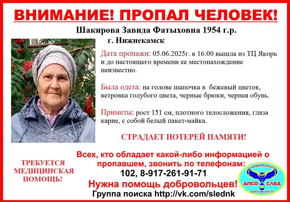 Она была одета в шапочку в бежевый цветок, ветровку голубого цвета, черные брюки и черную обувь. Завида Шакирова ростом 151 см, плотного телосложения, с карими глазами. С собой у неё был белый пакет-майка. Отмечено, что она страдает потерей памяти и нуждается в медицинской помощи.