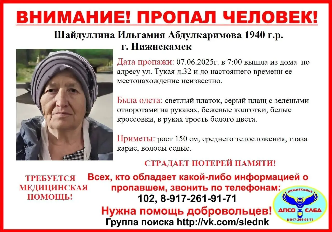 Нижнекамка страдает потерей памяти и нуждается в медпомощи. Всех, кто обладает какой-либо информацией о пропавшей, просят сообщить об этом по телефонам: 102 или 8 (917) 261-91-71.