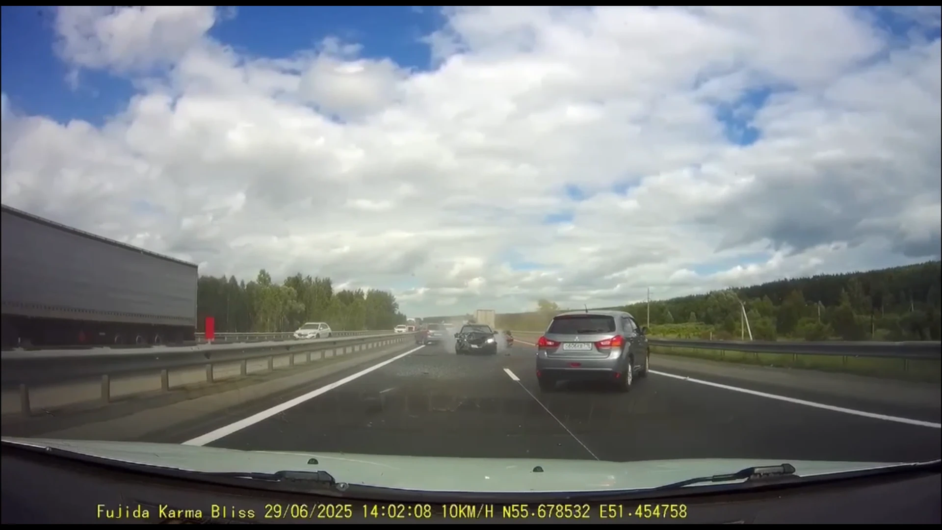 На кадрах с места происшествия, снятых на видеорегистратор, можно заметить, что одна из машин от удара опрокинулась на крышу, у второй сильно помята передняя часть.