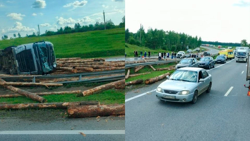 Очевидцы публикуют фото и видео в соцсетях. На них видно, что большегруз лежит на боку, по трассе раскиданы большие брёвна, а легковое авто серьёзно пострадало. На месте работают спецслужбы, о пострадавших неизвестно.