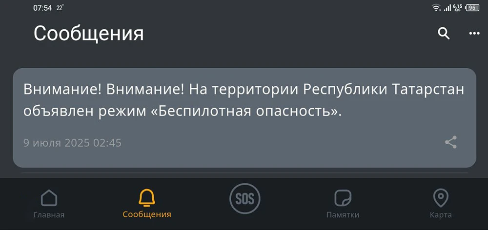 В Татарстане с 2 часов 45 минут ночи 9 июля действует режим «Беспилотная опасность».