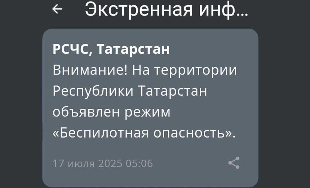Стоит отметить, что в последний раз режим «Беспилотная опасность» на территории Татарстана вводился 15 июля. В тот день он действовал с 3 часов утра до 6 часов вечера.