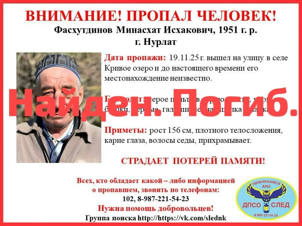 Также поисковики оповестили о гибели другого разыскиваемого — 74-летнего жителя Нурлата Минасхата Фасхутдинова, пропавшего 19 ноября. Сообщалось, что он может находиться в Нижнекамске.