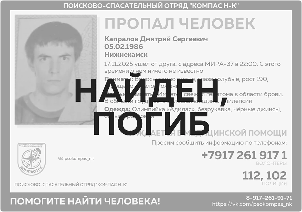 Пропавший 17 ноября 2025 года 39-летний житель Нижнекамска Дмитрий Капралов найден мертвым. Об этом сообщается на странице поисково-спасательного отряда «Компас Н-К».