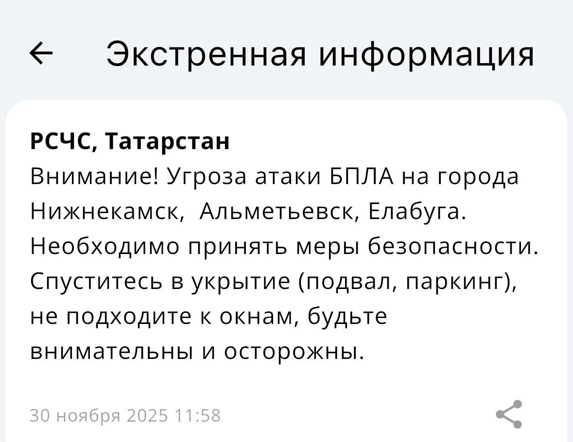 МЧС разослало оповещения об угрозе беспилотной атаки на Нижнекамск, Альметьевск и Елабугу.