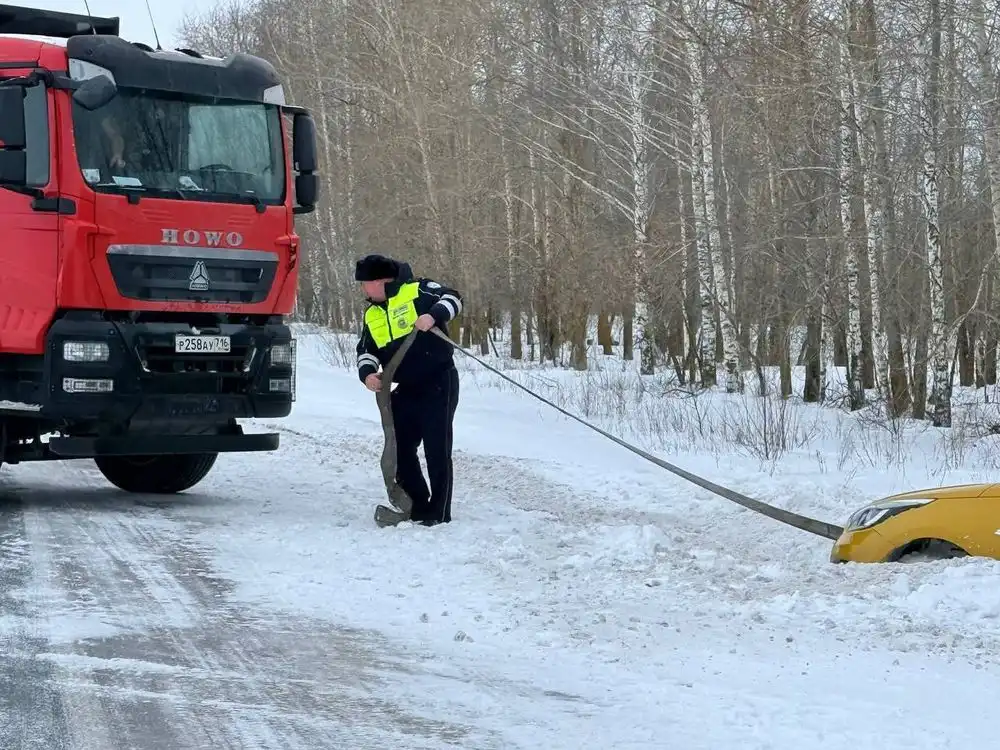На 75-м километре трассы Чистополь – Нижнекамск во время патрулирования экипаж ДПС заметил съехавший с проезжей части и увязший в снегу автомобиль «КИА», сообщает пресс-служба ведомства.