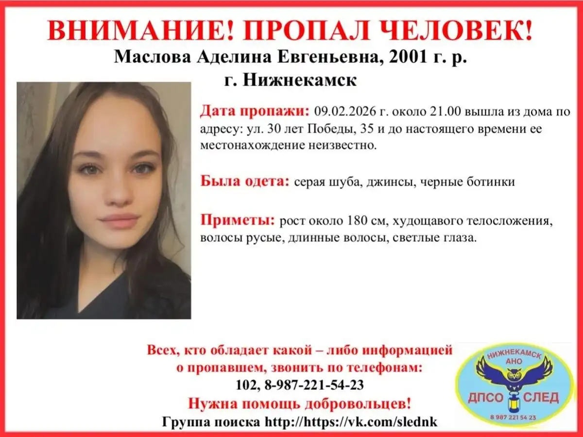 В Нижнекамске пропала Аделина Маслова 2001 года рождения. 9 февраля около 21 часа она вышла из вышла из дома по адресу: ул. 30 лет Победы, 35 и до настоящего времени её местонахождение неизвестно.