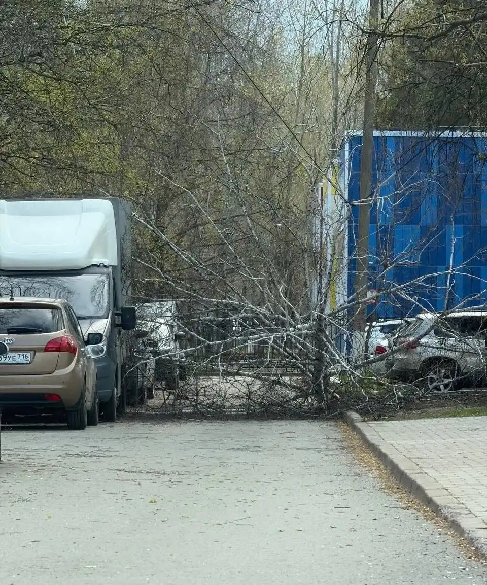 В Нижнекамске штормовой ветер привёл к падению деревьев. На данный момент известно о двух случаях: на пр. Шинников рядом с домом № 53 и на Тукая около дома № 35.