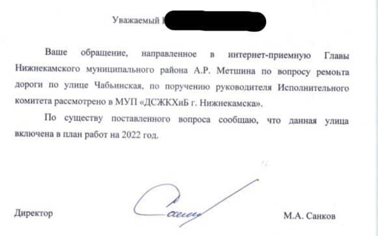 В письме, адресованном жителю города, отправившему ранее обращение через электронную приемную мэра города Айдара Метшина, говорится, что вопрос был рассмотрен в МУП «ДСЖКХиБ» Нижнекамска.