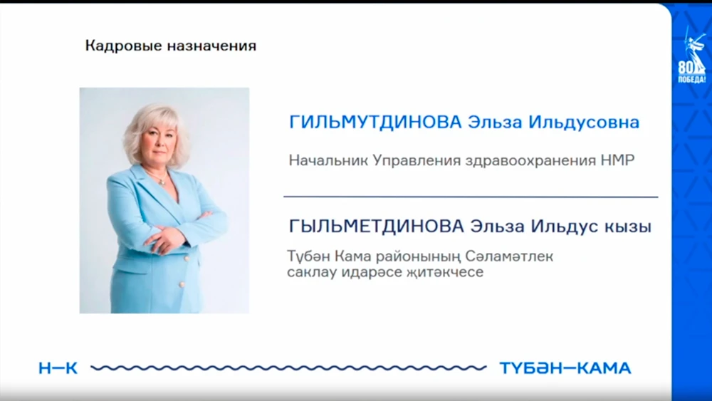 Кроме того, начальником управления здравоохранения НМР стала Эльза Гильмутдинова. Ранее она занимала пост главного врача Нижнекамского филиала центра гигиены и эпидемиологии РТ.