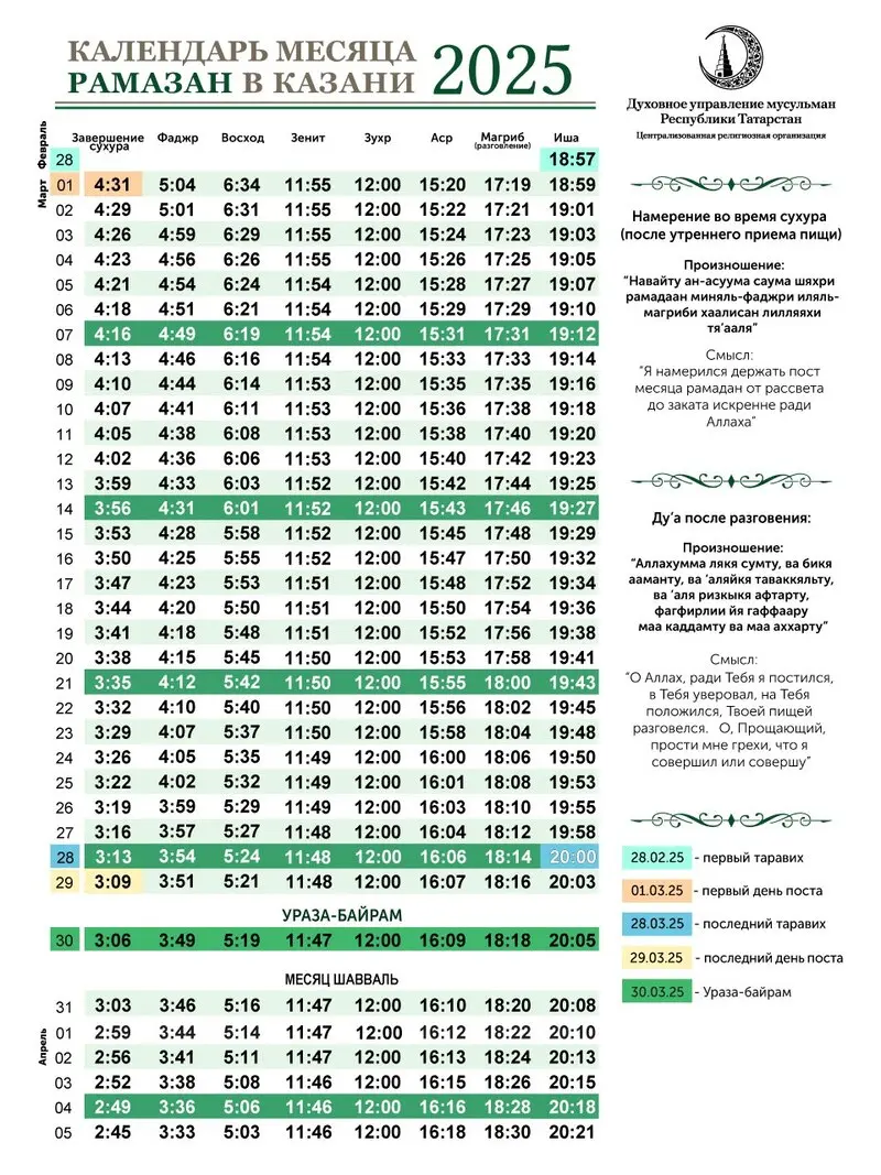 Духовное управление мусульман (ДУМ) Республики Татарстан опубликовало расписание, определяющее время начала и завершения поста для мусульман в течение священного месяца Рамадан.