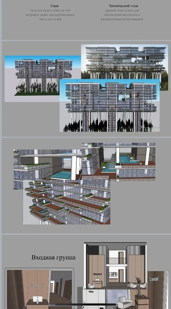 Их решение — дома на сваях высотой 35 метров для жилой застройки в Корабельной Роще — позволяет практически не трогать лесной массив: опоры передают нагрузку на глубинные несущие слои грунта, снижая давление на поверхность, сохраняя корни деревьев, почвенный покров и естественный рост растительности. Такая технология минимизирует воздействие на экосистему и сохраняет ландшафт в естественном виде.