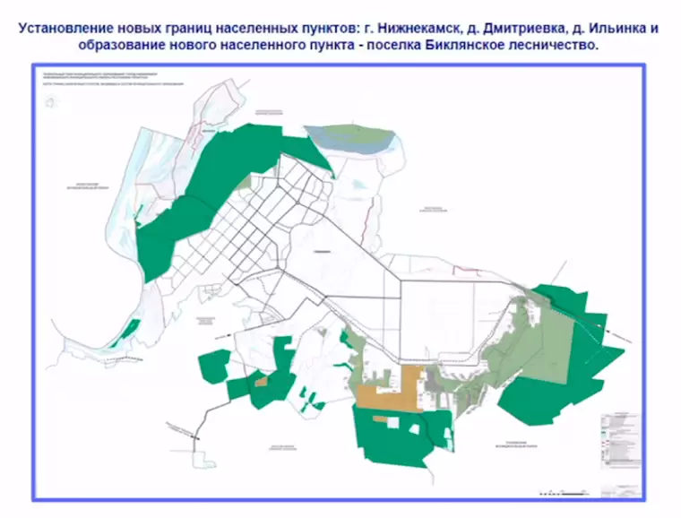 В частности изменяются границы Нижнекамска: исключается часть земель лесного фонда (отмечены на карте зеленым) и включатся земли по лесной амнистии (отмечены коричневым).