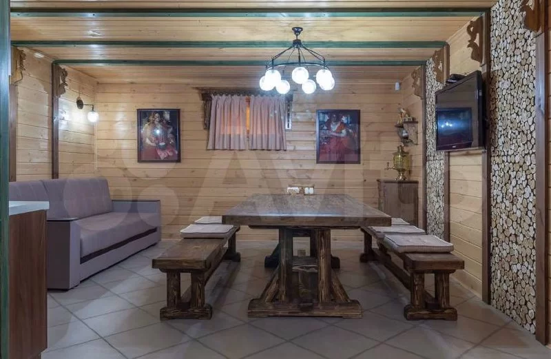 В доме выполнен современный ремонт, большая часть мебели изготовлена на заказ, пишет продавец. Имеется своя сауна, бильярдная, комната караоке. На территории расположена детская площадка, беседка и гараж.
