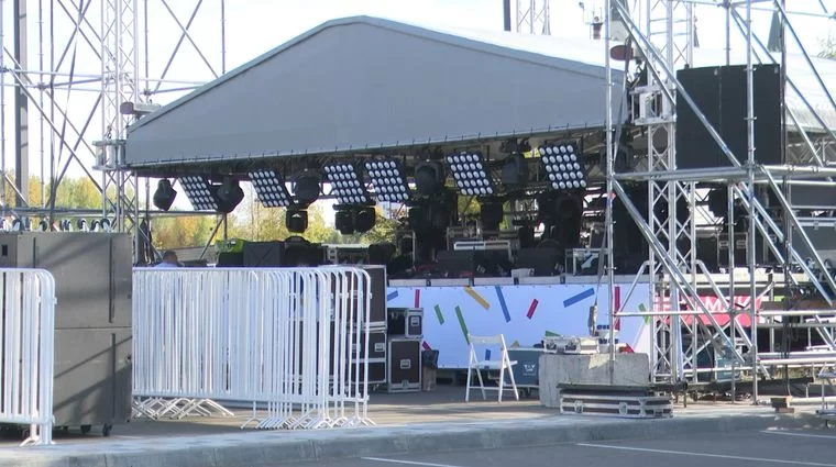 В Нижнекамске у торгового центра «Манзара» на проспекте Шинников монтируют сцену для праздничного концерта ко Дню города.