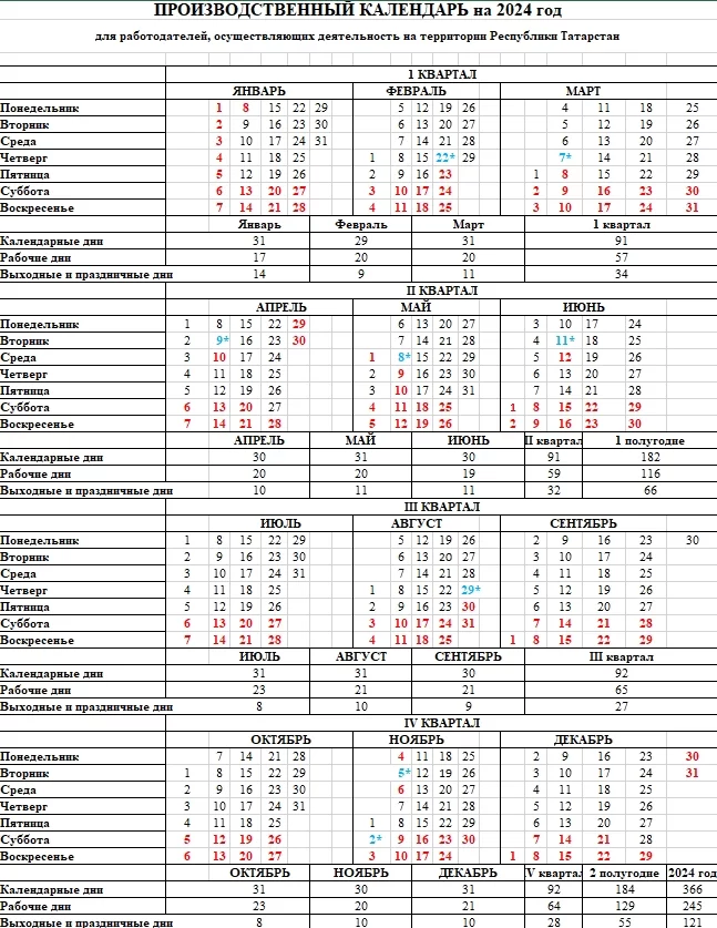В 2024 году у жителей Татарстана, работающих по графику 5/2, будет 121 выходной и праздничный день.