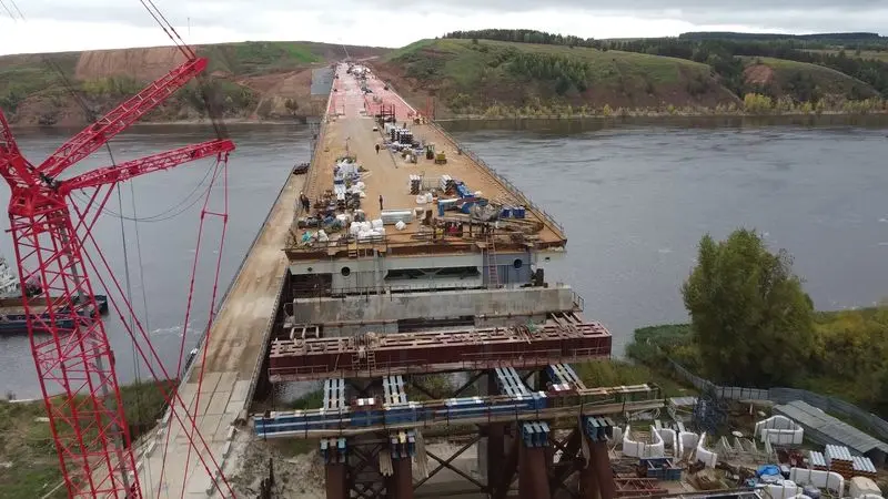 Готовность моста составляет 89%. Завершается опускание пролетного строения на опоры, ведётся работы по устройству сопряжения насыпи земляного полотна с опорами моста, окраске опор и пролетного строения.