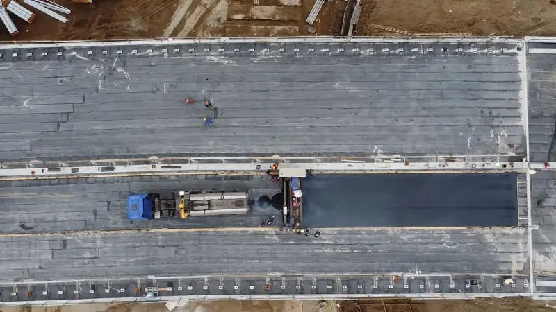 Сейчас ведётся устройство нижнего слоя дорожного покрытия на эстакадной части моста. Покрытие будет двухслойным.
