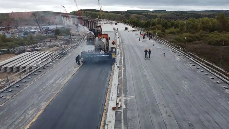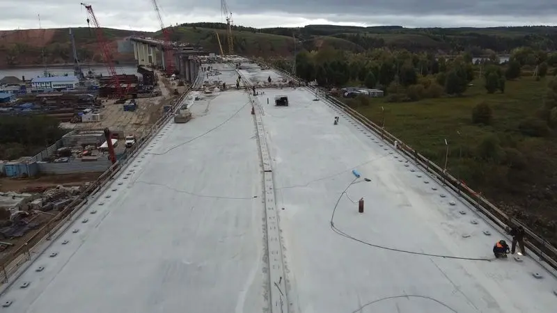 Дорожники начали укладку покрытия на мосту через Каму в составе обхода Нижнекамска и Набережных Челнов.
