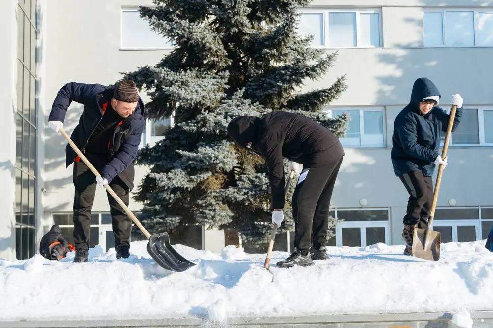 Помощь монтажников пришлась очень кстати. До этого снег, убранный с дорожек на клумбы перед входом, подтаивал, а позднее замерзал. Более десятка добровольцев за пару часов дружно ликвидировали снежные кучи.